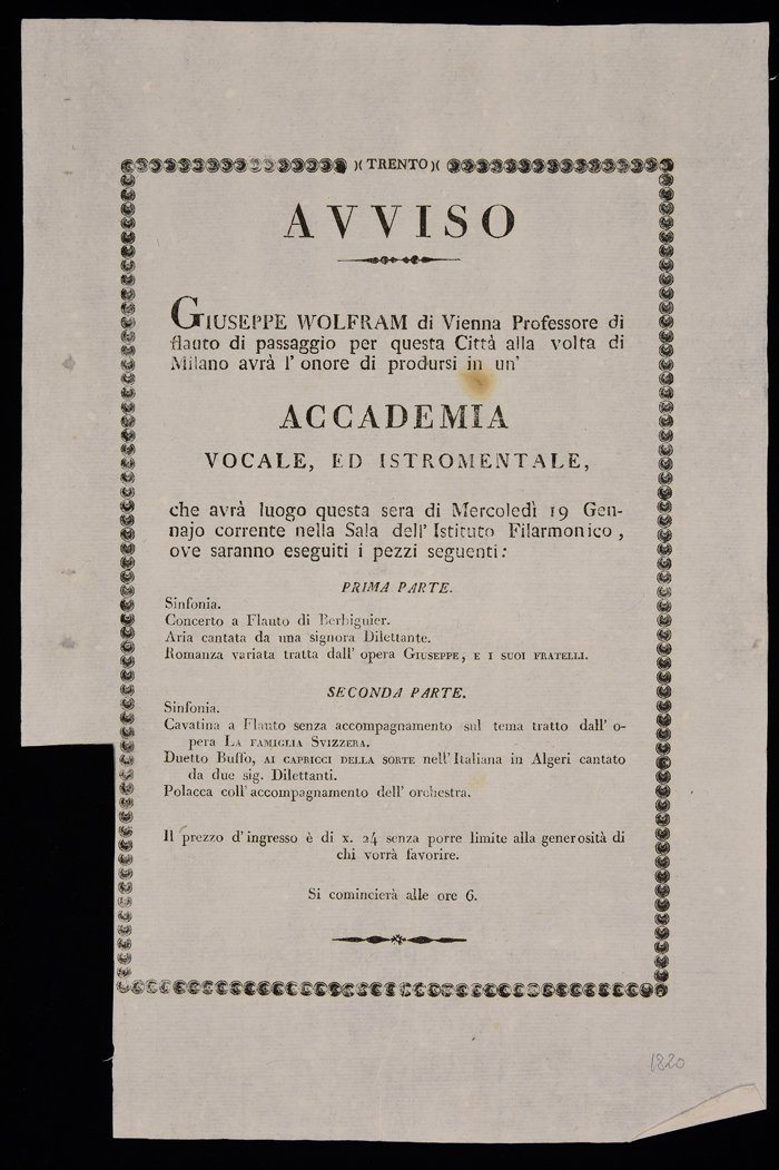 Giuseppe Wolfram di Vienna professore di flauto di passaggio per questa città alla volta di Milano avrà l'onore di prodursi in un'accademia vocale ed istromentale ...