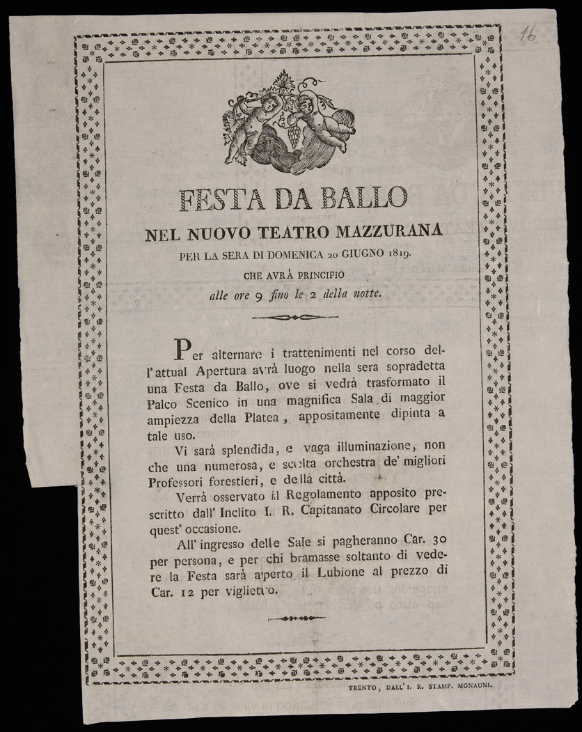 | Festa da ballo nel nuovo teatro Mazzurana per la sera di domenica 20 giugno 1819 che avrà principio alle ore 9 fino le 2 della notte |
