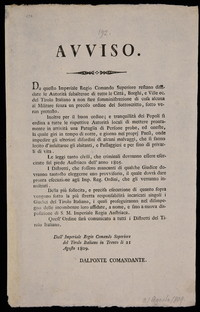 Da questo Imperiale Regio Comando superiore restano diffidate le autorità subalterne ...