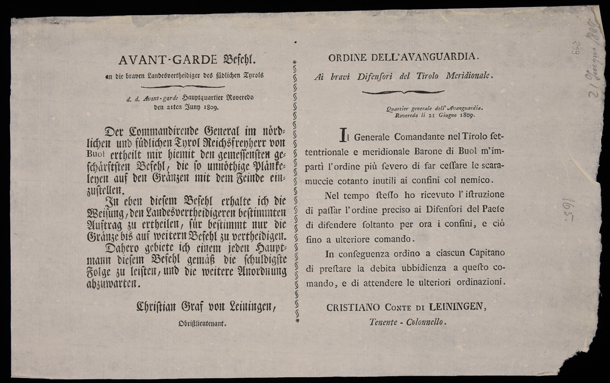 | Avant-Garde Befehl. An die braven Landesvertheidiger des südlichen Tyrols, d.d. Avant-garde Hauptquartier Roveredo den 21ten Junn 1809 |