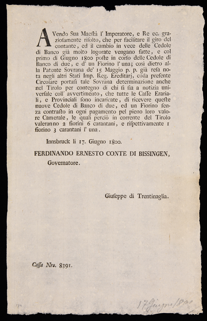 | Avendo sua maestà l'imperatore e re ec. graziosamente risolto, che per facilitare il giro del contante ... |