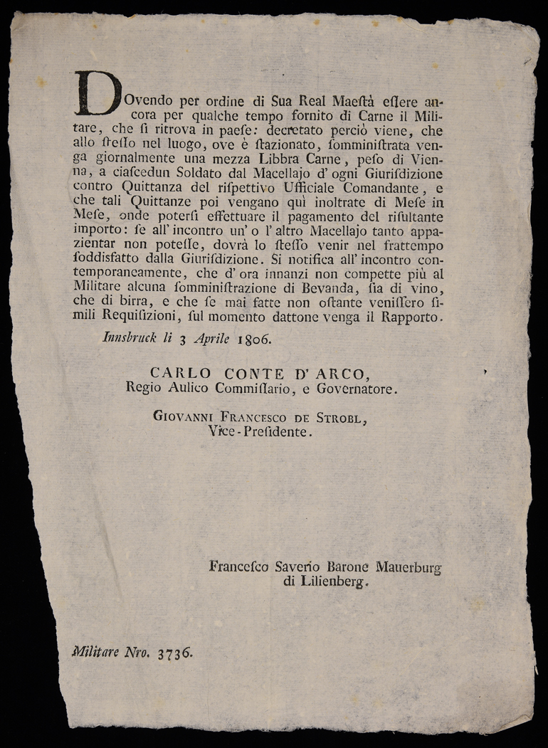 | Dovendo per ordine di sua real maestà essere ancora per qualche tempo fornito di carne il militare ... |