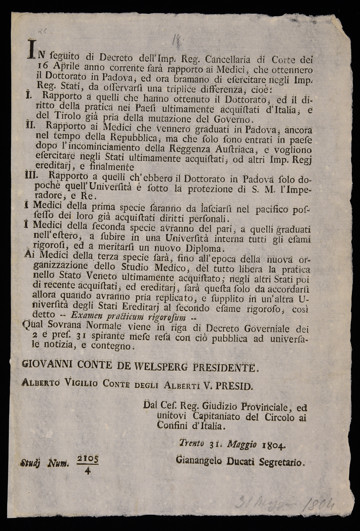 | In seguito di decreto dell'Imp. Reg. Cancelleria di corte dei 16 aprile anno corrente sarà rapporto ai medici ... |