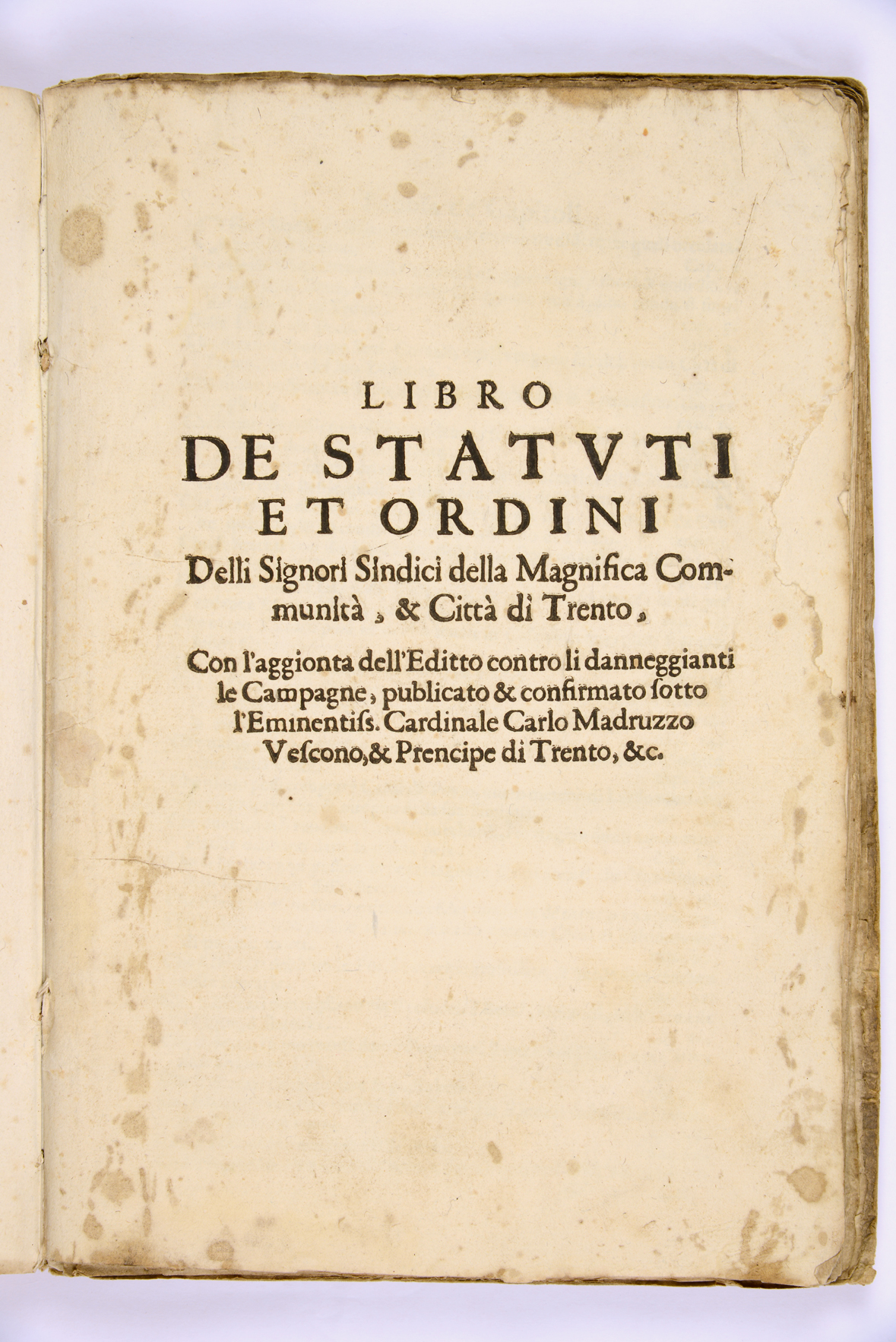 | Libro de statuti et ordini delli signori sindici della Magnifica Communità, & città di Trento, con l'aggionta dell'editto contro gli danneggianti le campagne, publicato & confirmato sotto l'eminentiss. cardinale Carlo Madruzzo vescono, & prencipe di Trento, &c. |