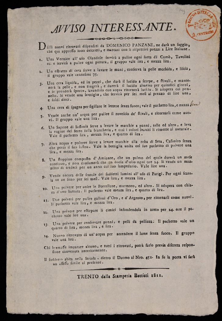 Delli nuovi ritrovati dispensati da Domenico Panzani, ne darà un saggio, che qui appresso sono descritti, e marcati con li rispettivi prezzi a lire italiane ...