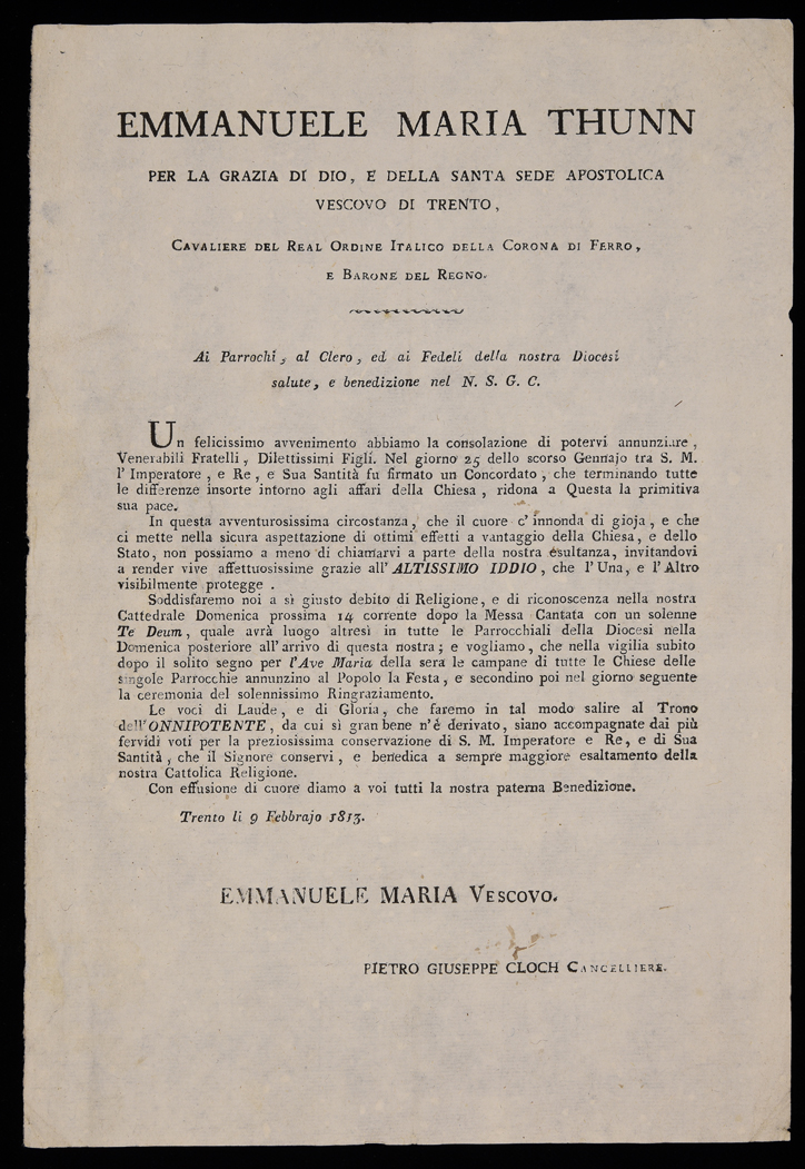 | Emmanuele Maria Thunn per la grazia di Dio, e della Santa Sede Apostolica vescovo di Trento, cavaliere del real ordine italico della Corona di ferro, e barone del Regno. Ai parrochi, al clero, ed ai fedeli della nostra diocesi salute, e benedizione nel N.S.G.C. |