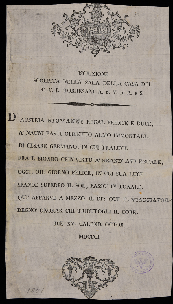 | Iscrizione scolpita nella sala della casa del C.C.L. Torresani A.d.V. d'A. e S. |