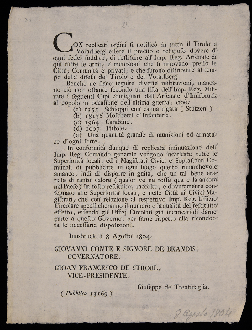 | Con replicati ordini si notificò in tutto il Tirolo e Vorarlberg essere il preciso e religioso dovere d'ogni fedel suddito, di restituire all'Imp. Reg. Arsenale di quì tutte le armi ... |
