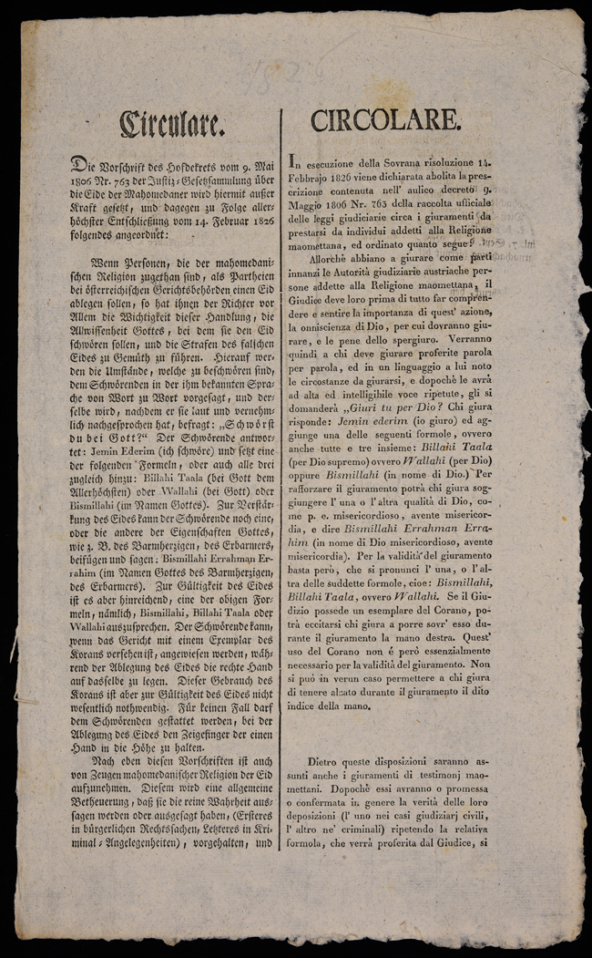 Die Vorschrift des Hofdekrets vom 9. Mai 1806 Nr. 763 der Justiz-Gesetzsammlung über die Eide der Maohomedaner wird Hiermit ausser Kraft gesetzt ...