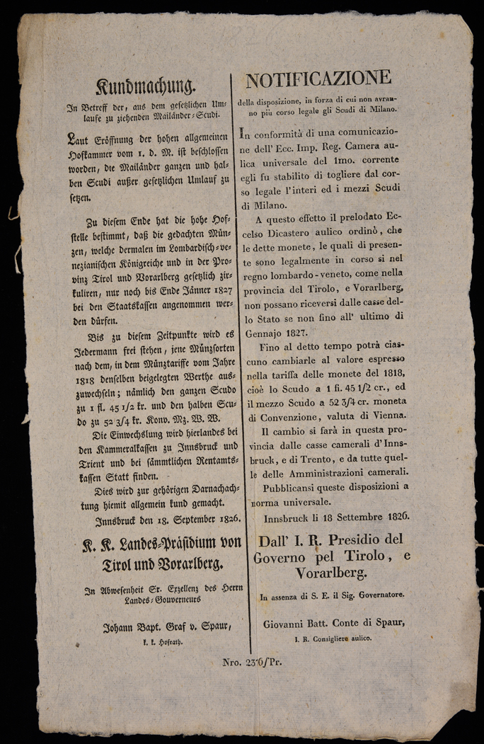 | Kundmachung in Betreff der, aus dem gesetzlichen Umlaufe zu ziehenden mailänder-Scudi |
