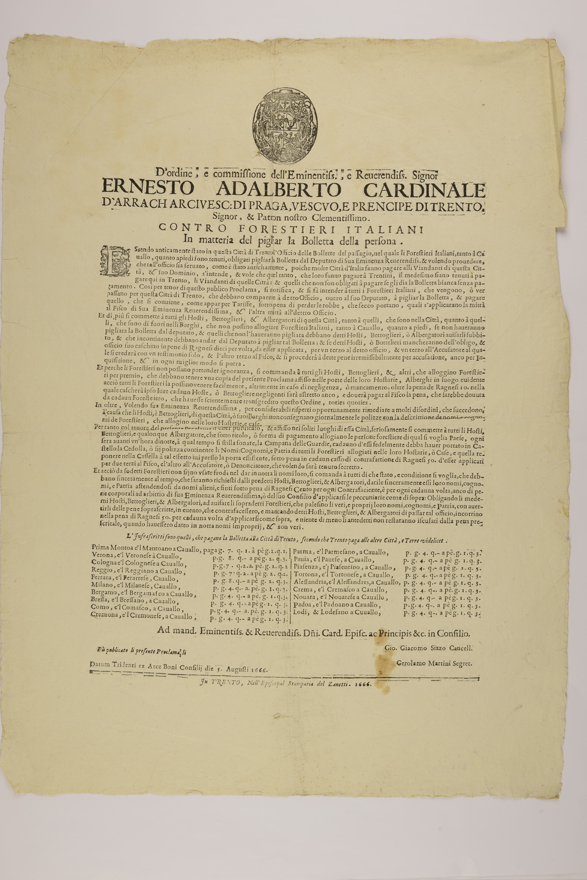 Proclama sui forestieri italiani emanato il 5 agosto 1666 da Ernesto Adalberto Harrach, principe-vescovo di Trento, sottoscritto da Giovanni Giacomo Sizzo e Girolamo Martini, spazio lasciato bianco per integrare la data di pubblicazione, non presente
