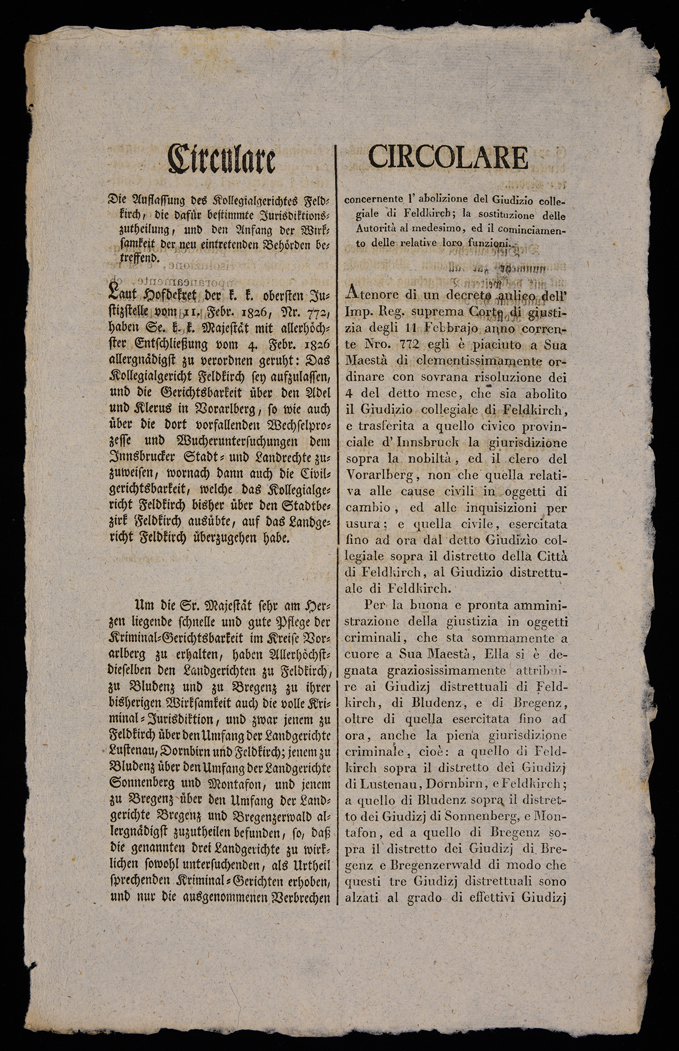 | Circulare die Auflassung des Kollegialgerichtes Feldkirch, die dafür bestimmte Jurisdiktionszutheilung, und den Anfang der Wirksamkeit der neu eintretenden Behörden betreffend |
