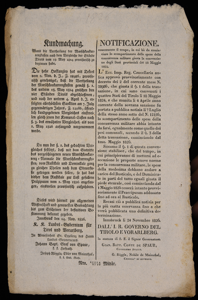 | Kundmachung. Wann die Vertheilung der Marschkonkurrenzkosten nach dem Vergleiche der Stände Tirols vom 18. May 1824 provisorisch zu beginnen habe |