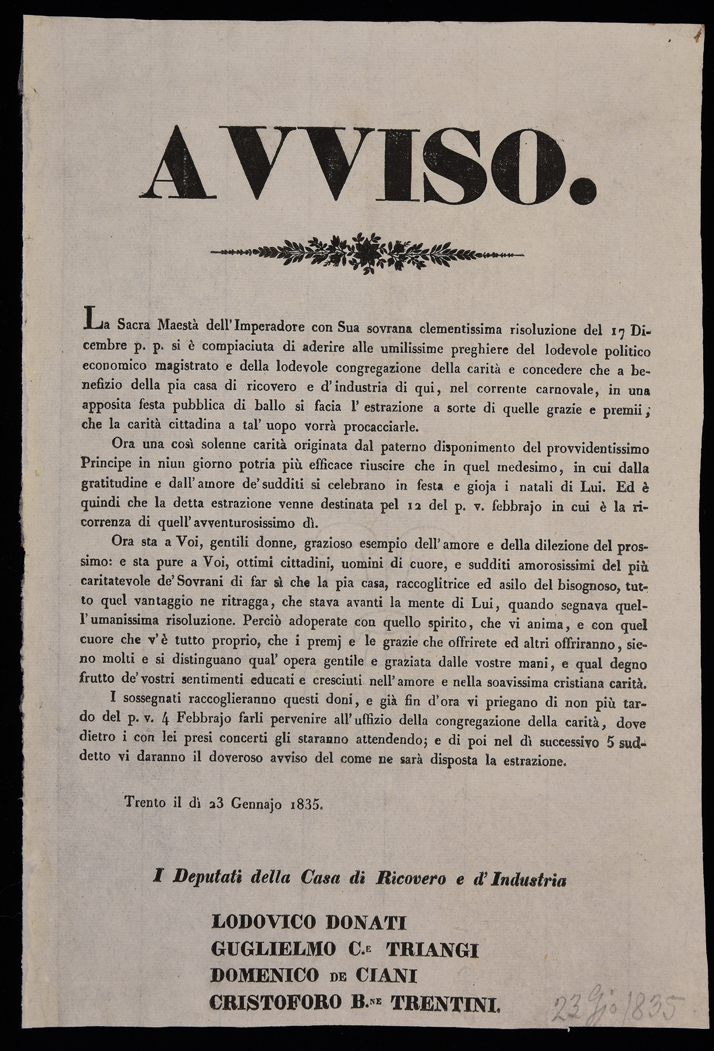 La sacra maestà dell'Imperadore con sua sovrana clementissima risoluzione del 17 dicembre p.p. si è compiaciuta di aderire alle umilissime preghiere del lodevole politico economico magistrato ...