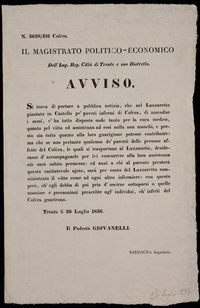 Si trova di portare a pubblica notizia, che nel lazzaretto piantato in castello pe' poveri infermi di colèra ...