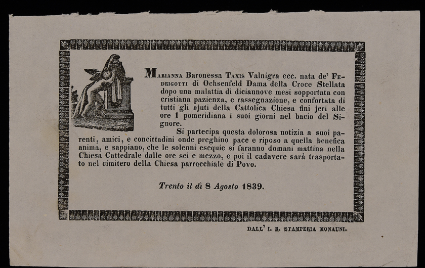 | Marianna baronessa Taxis Valnigra ecc. nata de' Fedrigotti di Ochsenfeld dama della Croce stellata ... fini jeri alle ore 1 pomeridiana i suoi giorni ... |