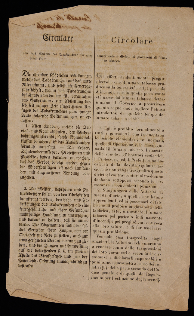 Circulare über das Verboth des Tabakrauchens für ganz junge Leute