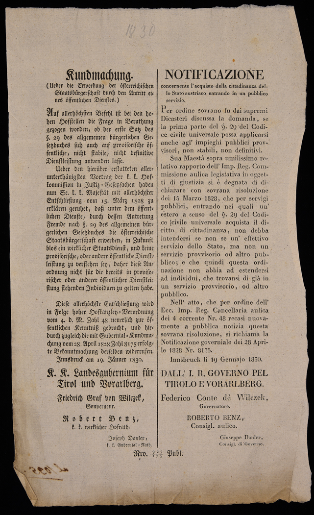 | Notificazione concernente l'acquisto della cittadinanza dello Stato austriaco entrando in un pubblico servizio |