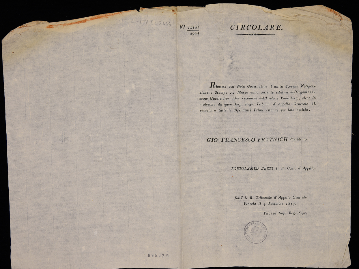 Rimessa con nota governativa l'unita sovrana notificazione a stampa 14 marzo anno corrente relativa all'organizzazione giudiziaria della provincia del Tirolo e Vorarlberg ...