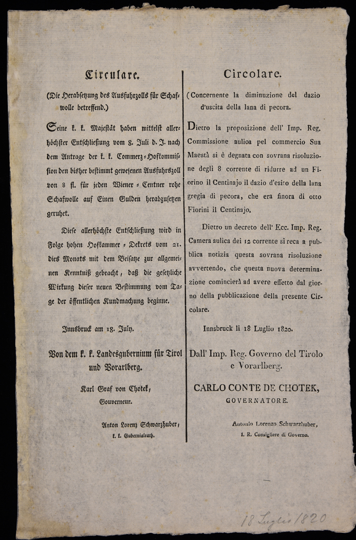 Circulare. (Die Herabsetzung des Ausfuhrzolls für Schafwolle betreffend)