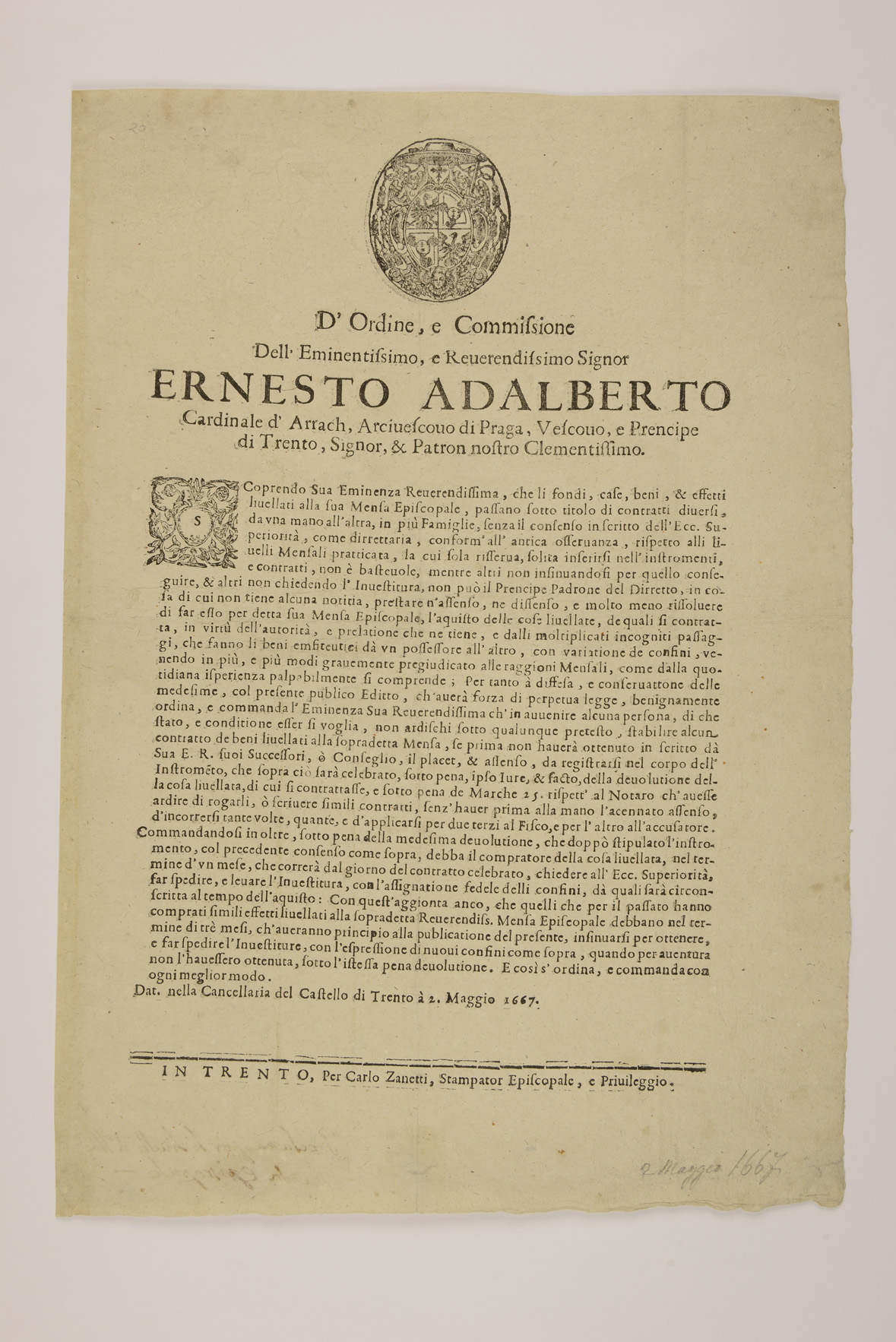 Proclama sui beni della mensa vescovile emanato il 2 maggio 1667 da Ernesto Adalberto Harrach, principe-vescovo di Trento
