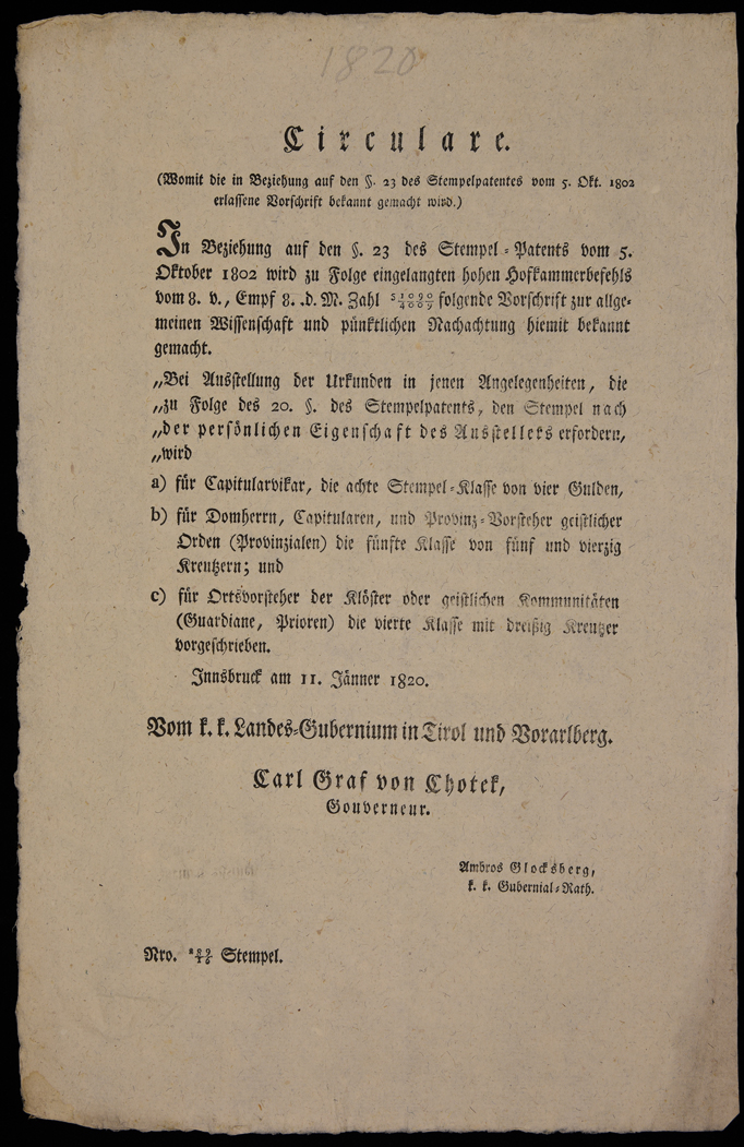 | Circulare. (Womit in Beziehung auf den § 23 des Stempelpatentes vom 5. Okt. 1802 erlassene Vorschrift bekannt gemacht wird) |