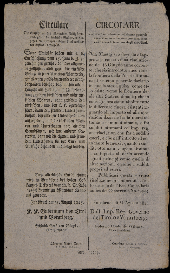 | Circulare die Einführung des allgemeinen Zollsytems auch gegen die türkische Gränze, wie es gegen die Gränzen anderer Nachbarstaaten besteht, betreffend |