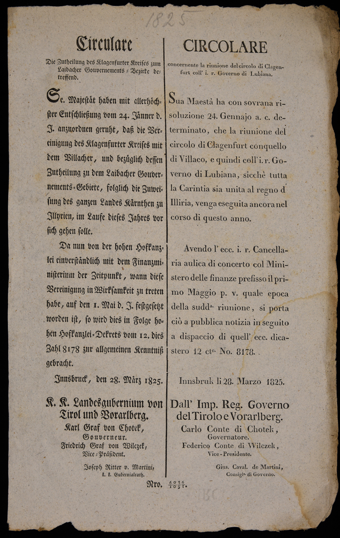| Circolare concernente la riunione del circolo di Clagenfurt coll'I.R. governo di Lubiana |