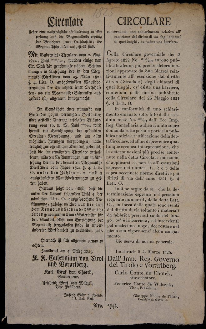 | Circulare ueber eine nachträgliche Erläuterung in Beziehung auf die Wegmauthsbefreyung der Bewohner jener Ortschaften, wo Wegmauthschranken aufgestellt sind |