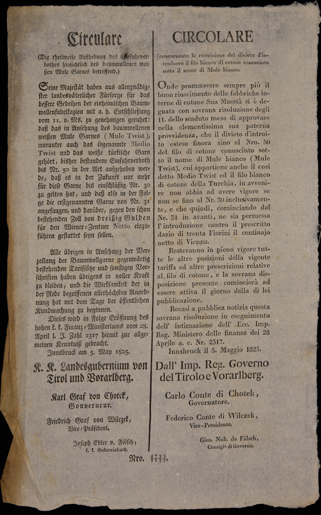 | Circulare (die theilweise Aufhebung des G[...]fuhrverbothes hinsichtlich des baumwollenen weissen Mule Garnes betreffend) |