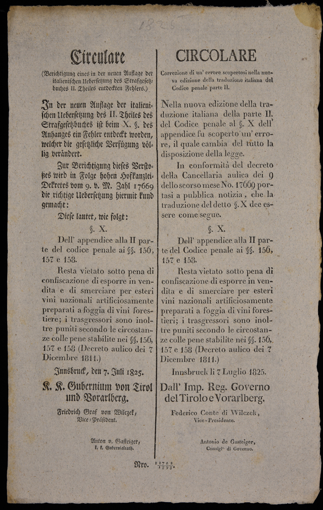 | Circulare (Berichtigung eines in der neuen Auflage der italienischen Uebersetzung des Strafgesetzbuches II. Theiles entdeckten Fehlers) |