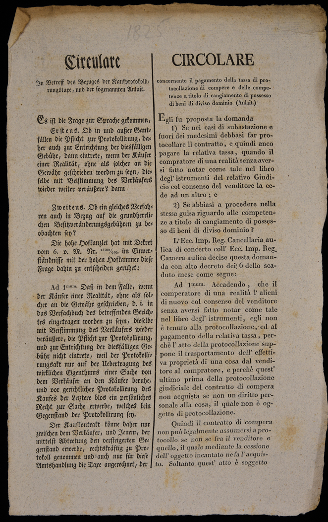 | Circulare in Betreff des Bezuges der Kaufprotokollirungstaxe, und der sogenannten Anlait |