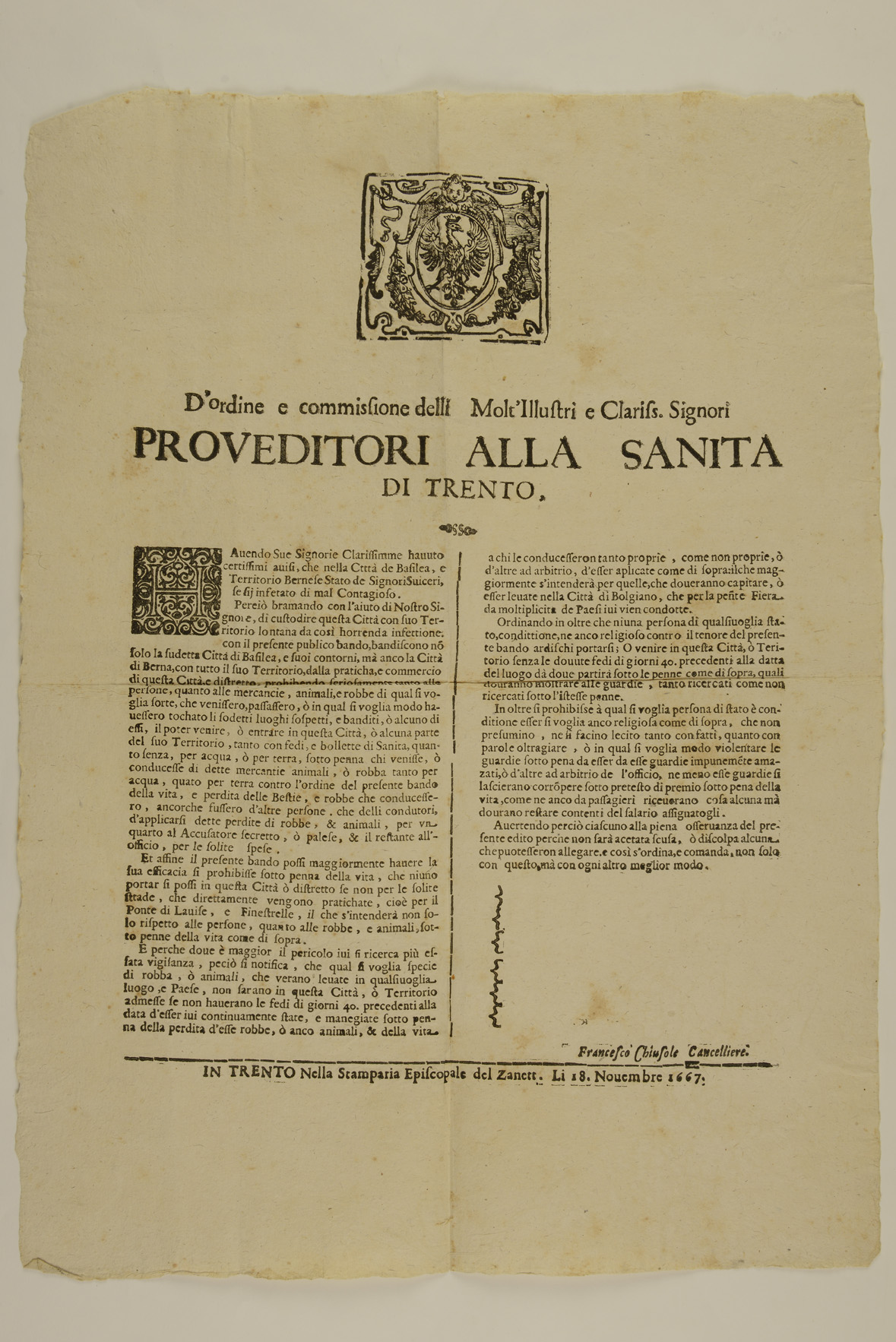 Proclama sulla prevenzione dei contagi emanato il 18 novembre 1667 dall'Ufficio della sanità di Trento, sottoscritto da Francesco Chiusole
