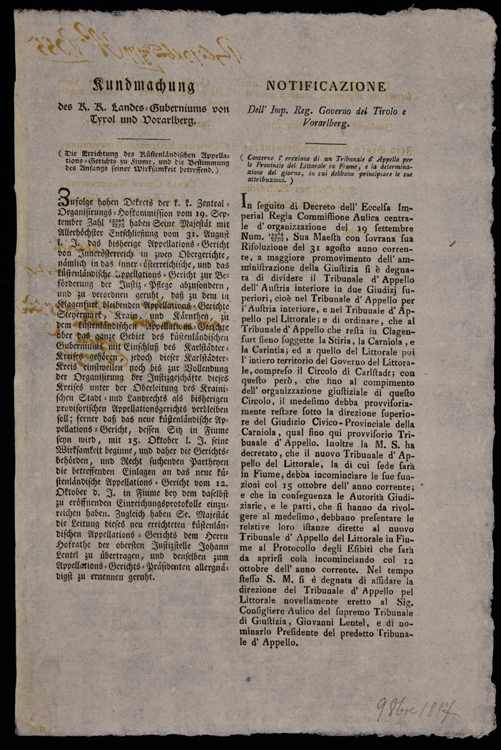 | Notificazione dell'imp. reg. governo del Tirolo e del Vorarlberg (concerne l'erezione di un tribunale d'Appello per le province del Littorale in Fiume, e la determinazione del giorno, in cui debbono principiare le sue attribuzioni) |