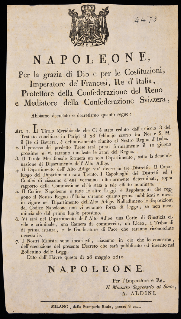 | Napoleone per la grazia di Dio e per le costituzioni imperatore de' Francesi, re d'Italia, protettore della Confederazione del Reno e mediatore della Confederazione svizzera, abbiamo decretato e decretiamo quanto segue |