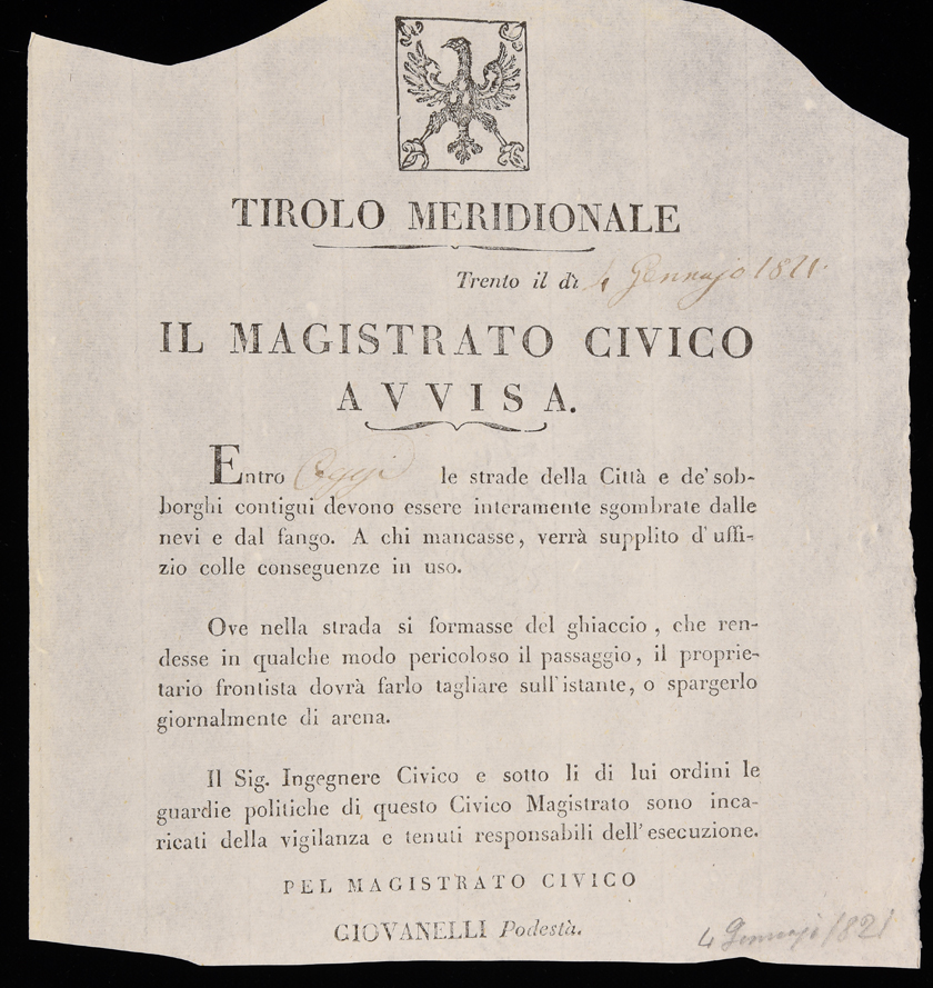 Tirolo meridionale. Trento il dì [4 gennaio 1821], il Magistrato civico avvisa