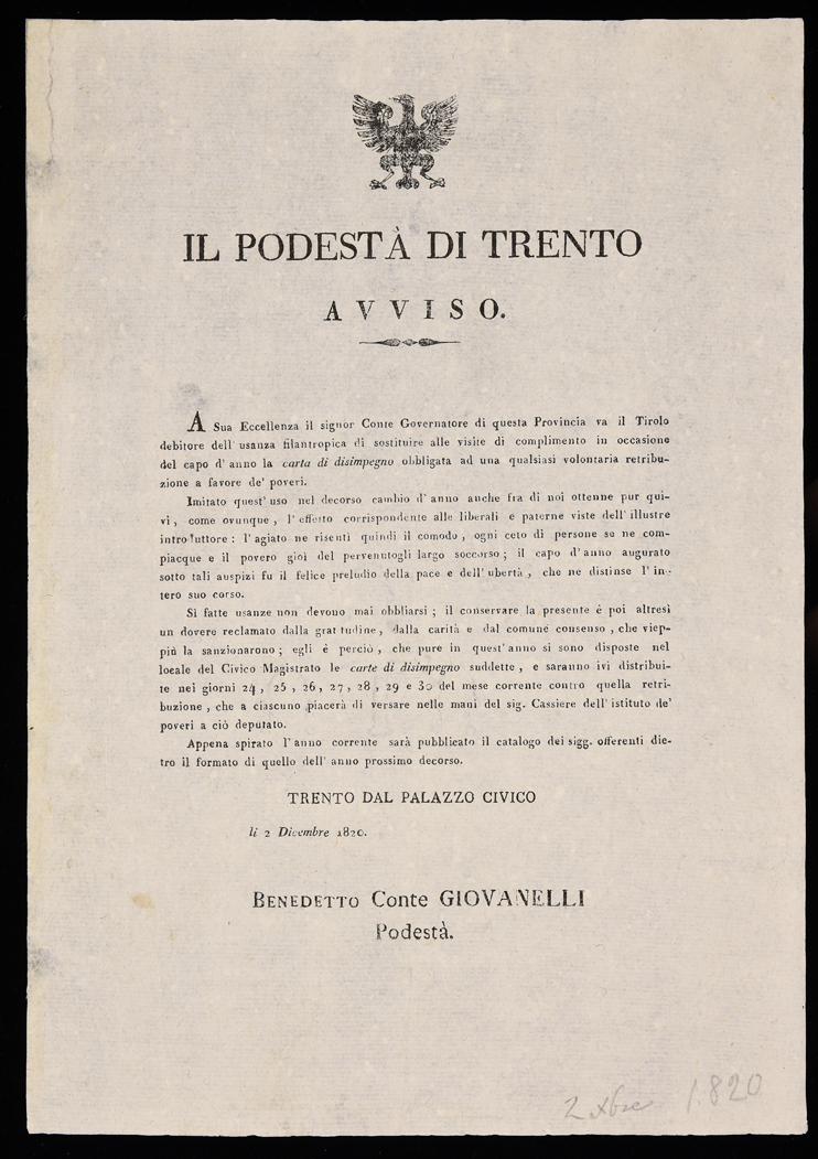 A sua eccellenza il signor conte governatore di questa provincia va il Tirolo debitore dell'usanza filantropica di sostituire alle visite di complimento in occasione del capo d'anno la carta di disimpegno ...