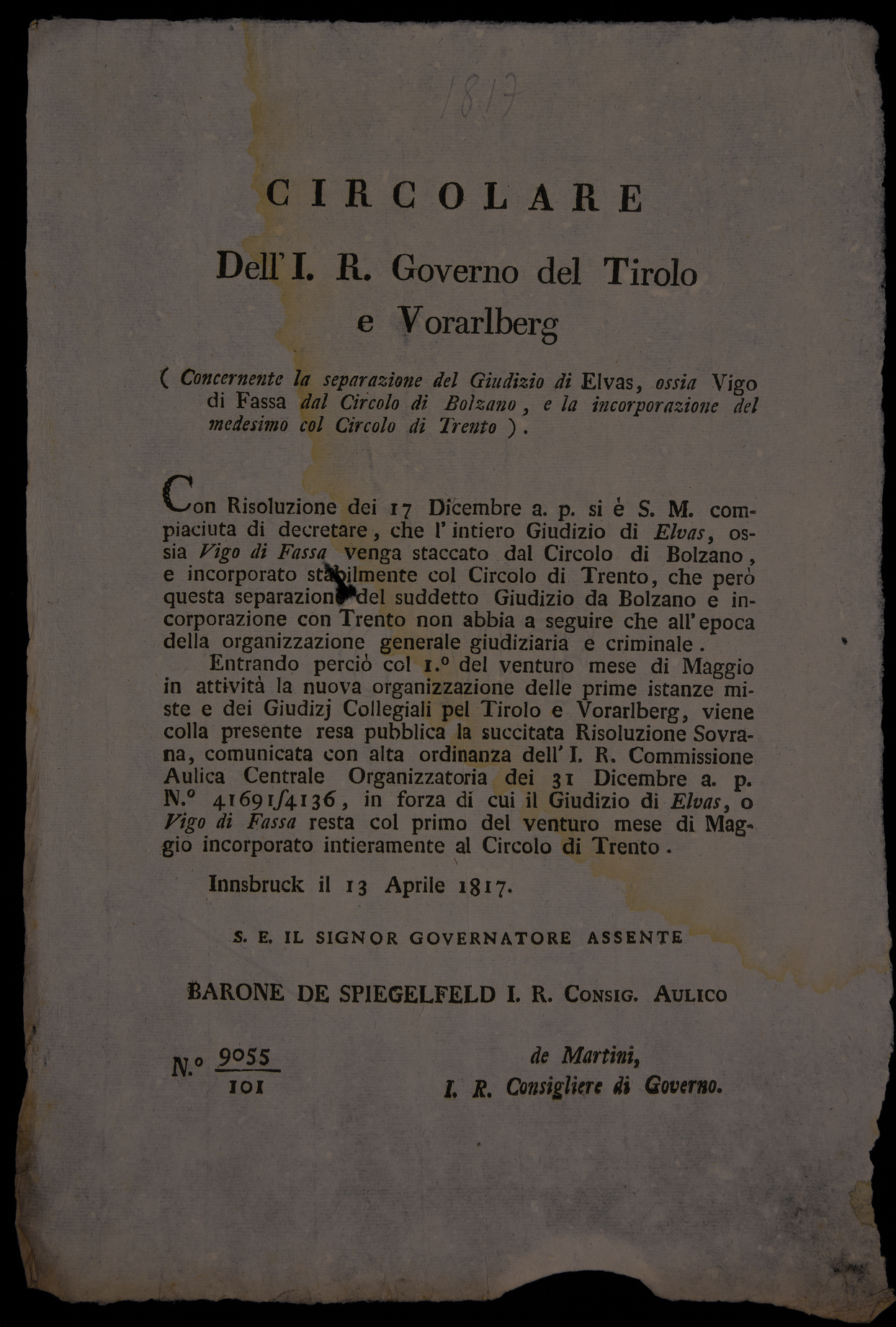 | Circolare dell'I.R. Governo del Tirolo e Vorarlberg (concernente la separazione del Giudizio di Elvas, ossia Vigo di Fassa dal Circolo di Bolzano, e la incorporazione del medesimo col Circolo di Trento) |