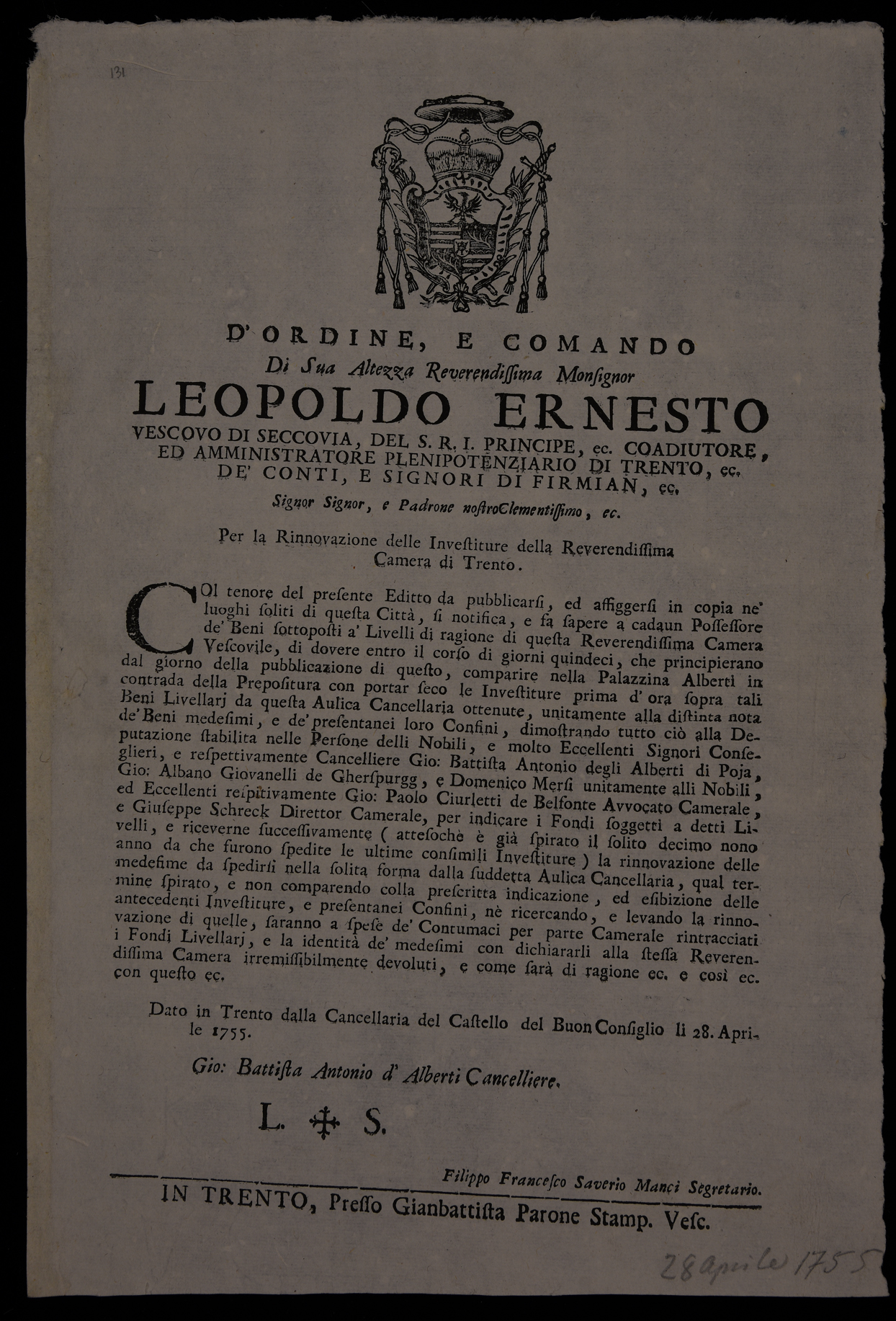 Proclama sul rinnovo delle investiture emanato il 28 aprile 1755 da Leopoldo Ernesto Firmian, stemma di Leopoldo Ernesto Firmian, sottoscritto da Battista Antonio Alberti (cancelliere) e da Filippo Francesco Saverio Manci (segretario).