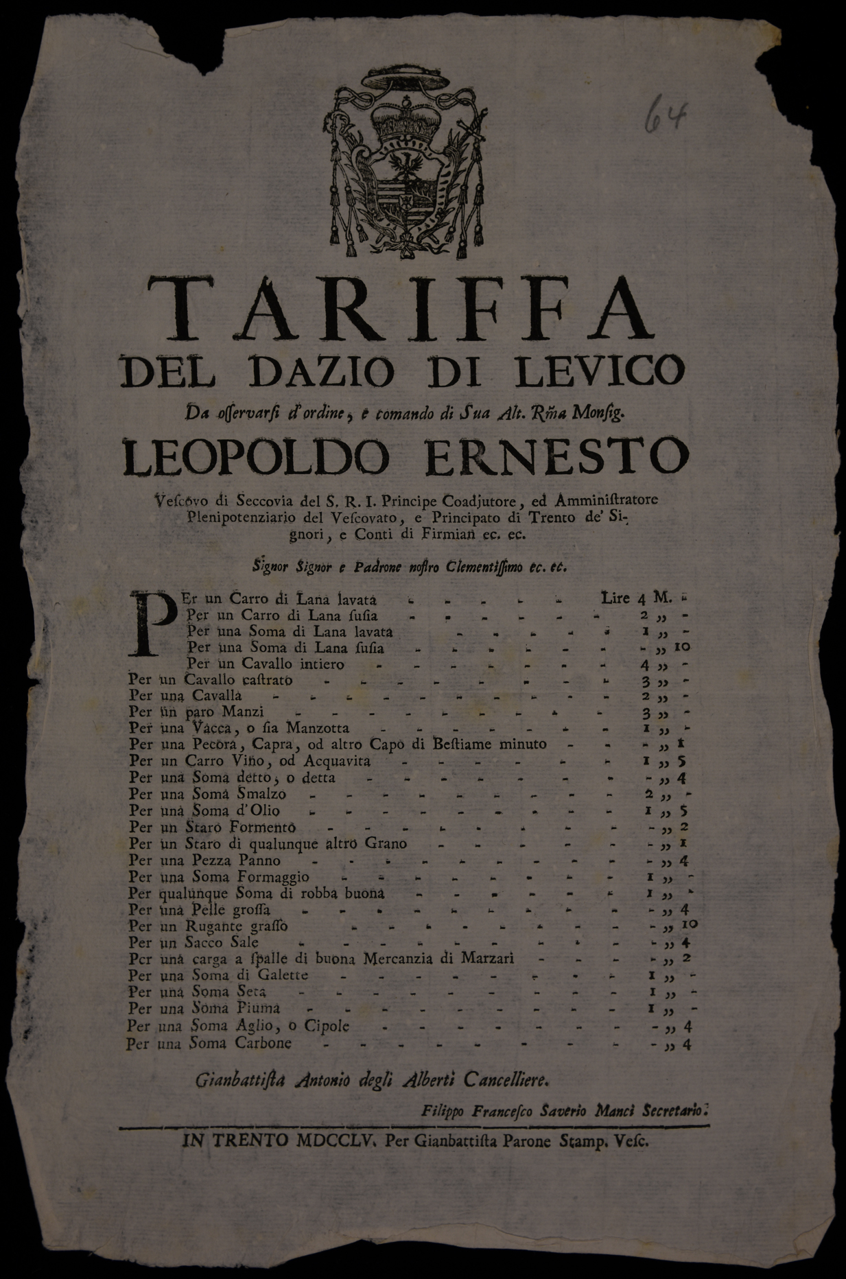 | Tariffa del dazio di Levico da osservarsi d'ordine e comando di sua alt. reverendissima monsig. Leopoldo Ernesto vescovo di Seccovia del S.R.I. principe coadjutore, ed amministratore plenipotenziario del vescovato, e principato di Trento de' signori, e conti di Firmian ec. ec. signor signor e padrone nostro clementissimo ec. ec. |