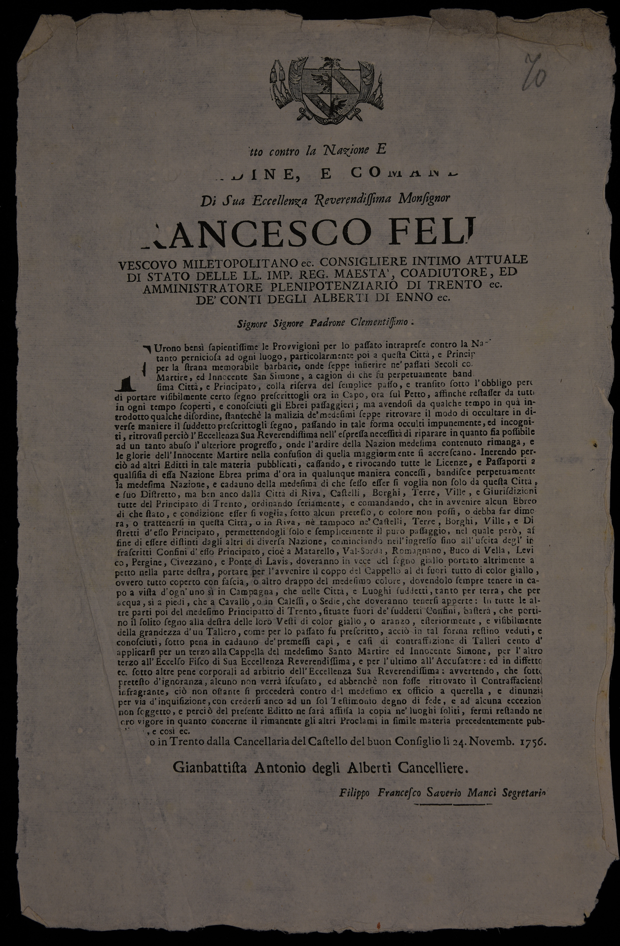| Editto contro la nazione ebrea. D'ordine, e comando di sua eccellenza reverendissima monsignor Francesco Felice vescovo miletopolitano ec. consigliere intimo attuale di Stato delle ll. imp. reg. maestà, coadiutore, ed amministratore plenipotenziario di Trento ec. de' conti degli Alberti di Enno ec. signore signore padrone clementissimo |