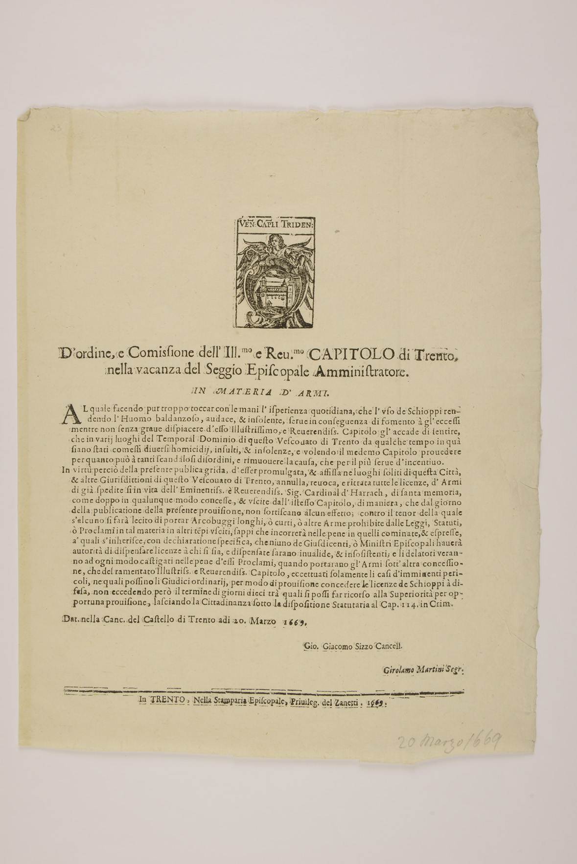 Proclama sulle armi emanato il 20 marzo 1669 emanato dal Capitolo di Trento e sottoscritto da Giovanni Giacomo Sizzo e Girolamo Martini
