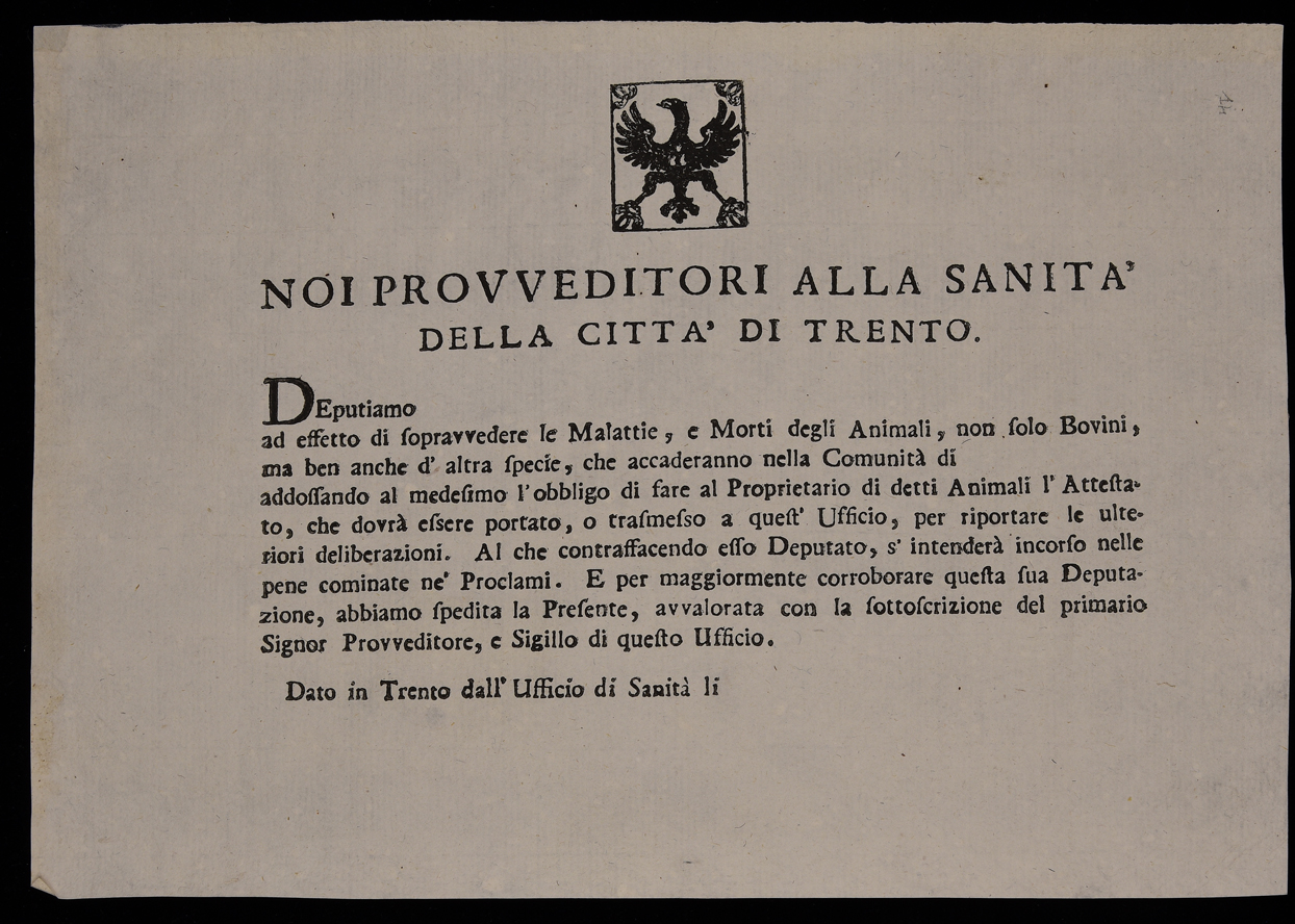 | Noi provveditori alla sanità della città di Trento, deputiamo ... ad effetto di sopravvedere le malattie e morti degli animali ... |