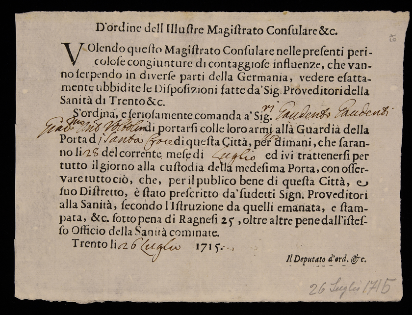 | D'ordine dell illustre Magistrato consulare &c. Volendo questo Magistrato consulare nelle presenti pericolose congiunture di contaggiose influenze ... |