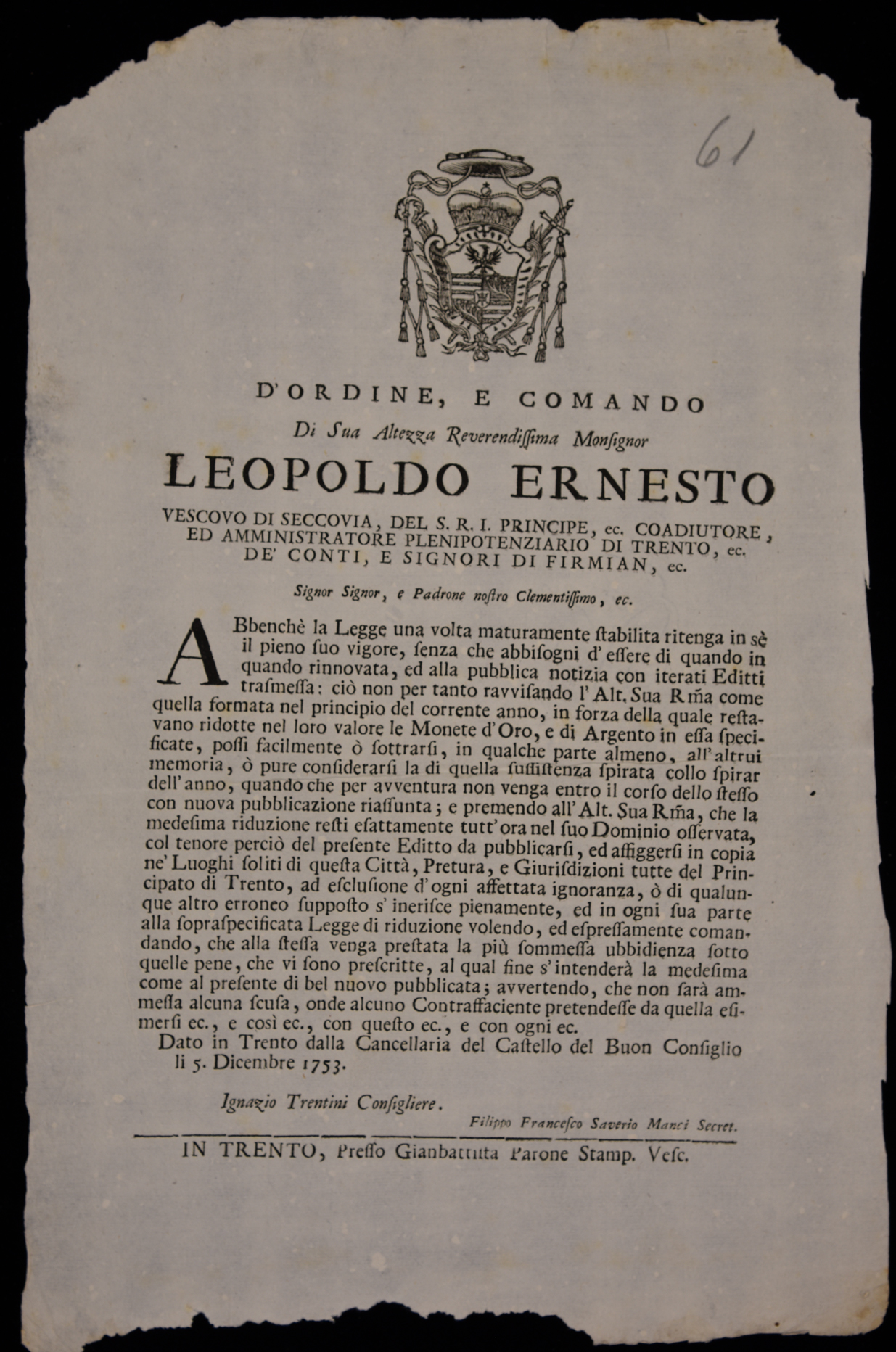 Proclama sulla svalutazione delle monete d'oro e d'argento emanato il 5 dicembre 1753 da Leopoldo Ernesto Firmian, stemma di Leopoldo Ernesto Firmian, sottoscritto da Ignazio Trentini (consigliere) e da Filippo Francesco Saverio Manci (segretario).