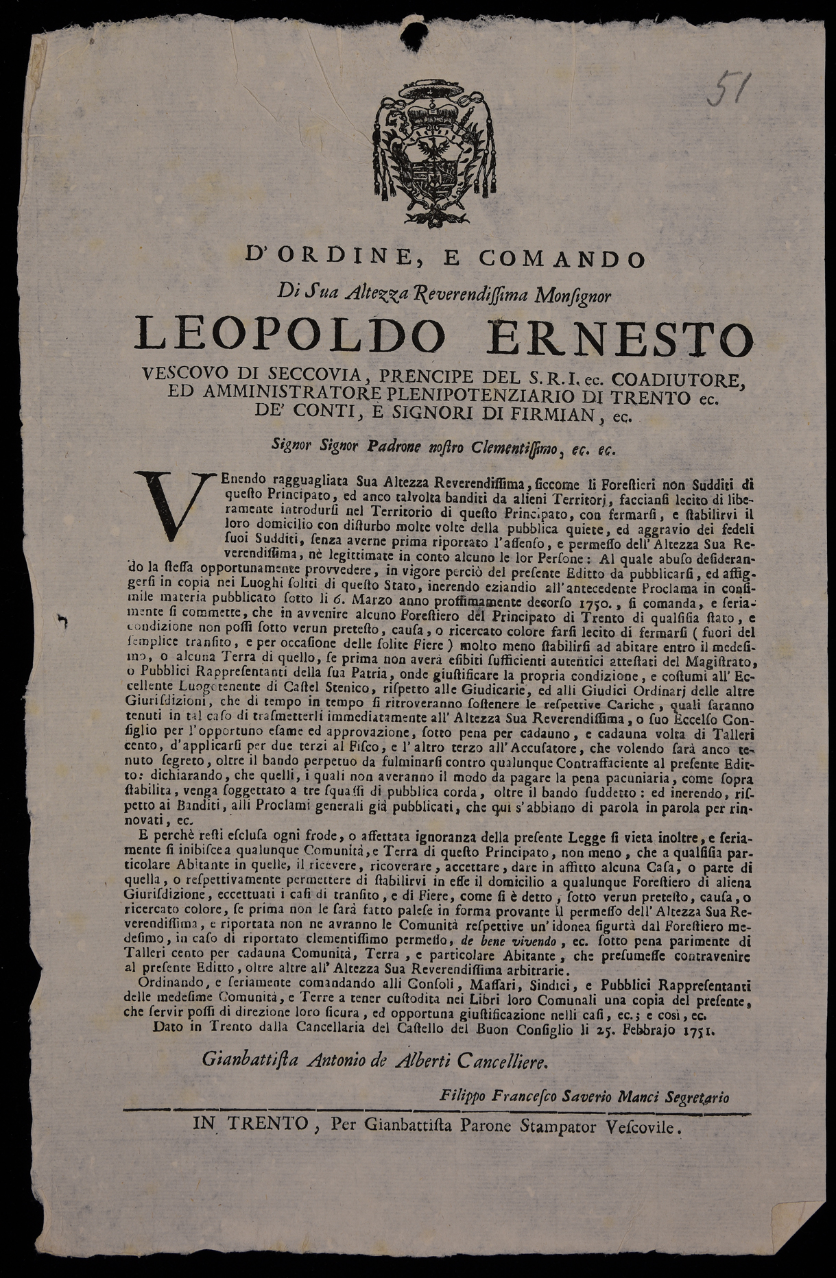Proclama sui forestieri emanato il 25 febbraio 1751 da Leopoldo Ernesto Firmian, stemma di Leopoldo Ernesto Firmian, sottoscritto da Giambattista Antonio Alberti (cancelliere) e da Filippo Francesco Saverio Manci (segretario).