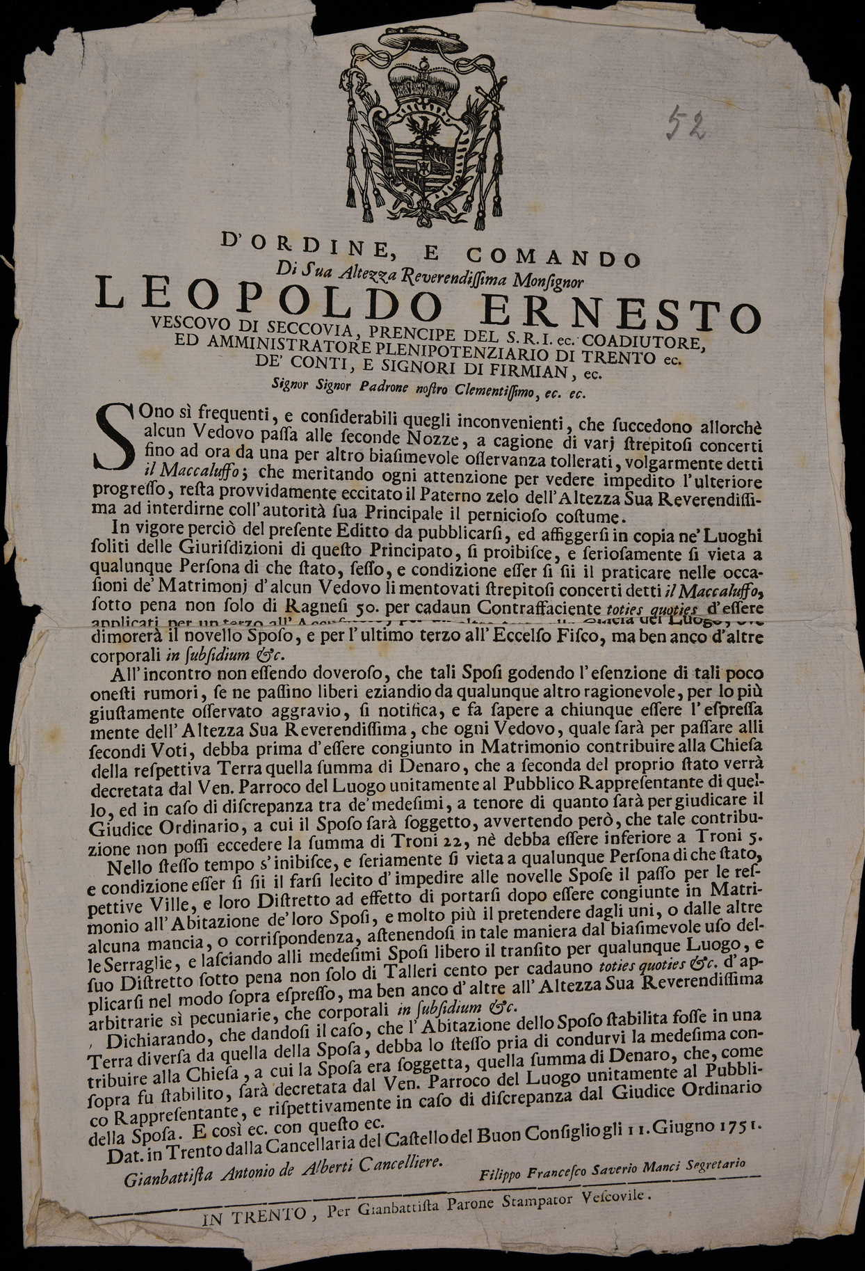 Proclama che vieta "il Macaluffo" e altre pratiche in occasione dei matrimoni dei vedovi emanato l'11 giugno 1751 da Leopoldo Ernesto Firmian, stemma di Leopoldo Ernesto Firmian, sottoscritto da Giambattista Antonio Alberti (cancelliere) e da Filippo Francesco Saverio Manci (segretario).