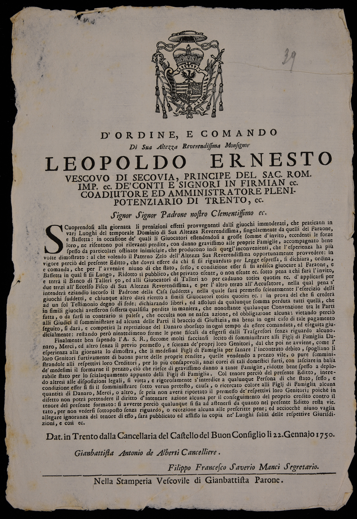 Proclama che vieta il gioco del faraone e della bassetta e il credito ai figli senza il permesso dei genitori emanato il 22 gennaio 1750 da Leopoldo Ernesto Firmian, stemma di Leopoldo Ernesto Firmian, sottoscritto da Giambattista Antonio Alberti (cancelliere) e da Filippo Francesco Saverio Manci (segretario).