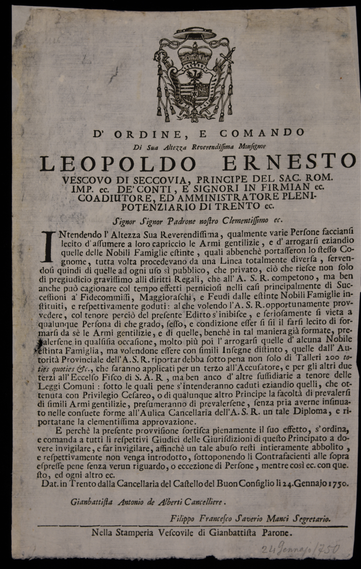 Proclama sugli stemmi gentilizi emanato il 24 gennaio 1750 da Leopoldo Ernesto Firmian, stemma di Leopoldo Ernesto Firmian, sottoscritto da Giambattista Antonio Alberti (cancelliere) e da Filippo Francesco Saverio Manci (segretario)