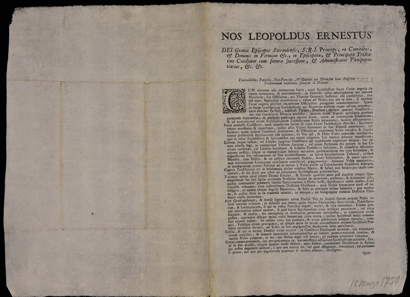 | Nos Leopoldus Ernestus Dei gratia episcopus Seccoviensis, S. R. I. princeps, ex comitibus & dominis in Firmian &c., in episcopatu & principatu tridentino coadjutor cum futura successione & administrator plenipotentiarius &c. &c. : venerabilibus parochis ... |